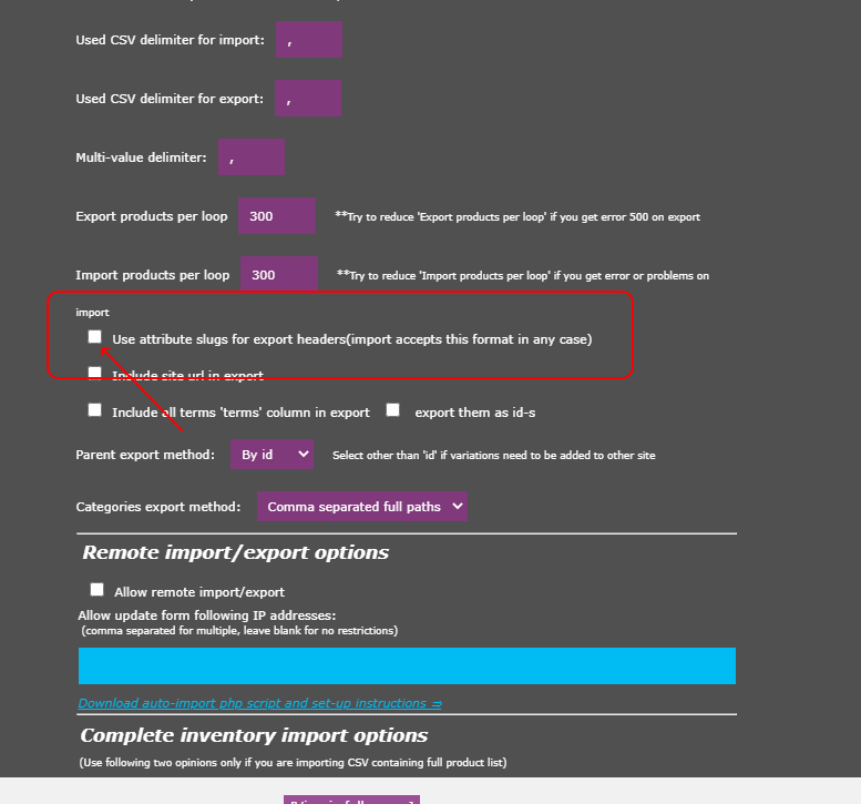 Export/import -> Import/export settings -> Use attribute slugs for export headers(import accepts this format in any case)